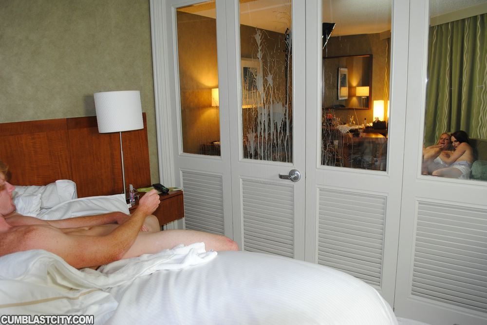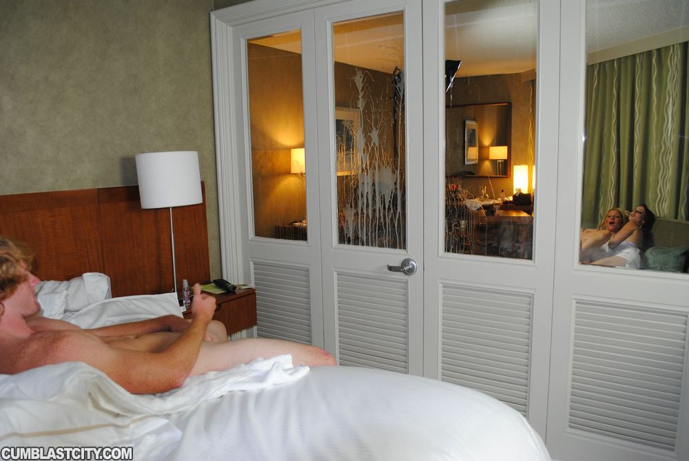 Audrey and Christina tweak their twats when the a perverted guy watches them. he gets so worked up he starts jerking his cock. Audrey and Christina watch him jack off while they play with their pussys. When the boy bursts all over the wall, they are shocked at the massive cumload