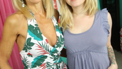 Moms Erica Lauren and Jackie stroke, suck and jerk off a massive cock when it erupts all over their faces in a colossal cumshot. The horny miffs cant believe the load he spurts out as they continue to work his cock dry.