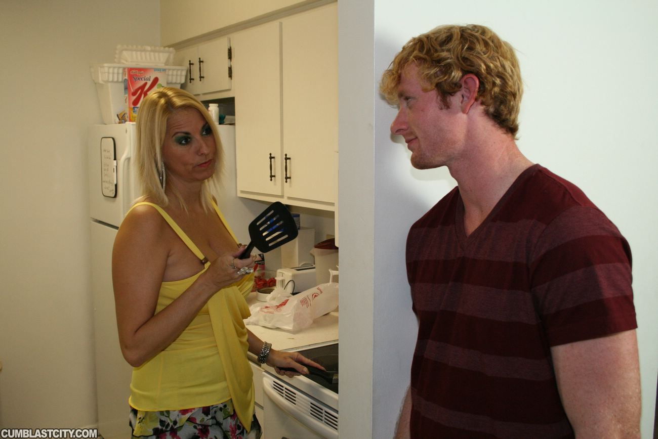 When Mom next door Dallas invites Joey over for dinner, the young kid is running a little late. But Dallas is furious and decides to teach him a lesson he wont soon forget. The mom lathers his cock up with cooking oil and jerks him off all over her face.