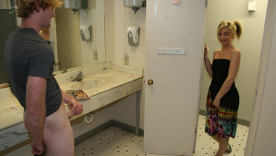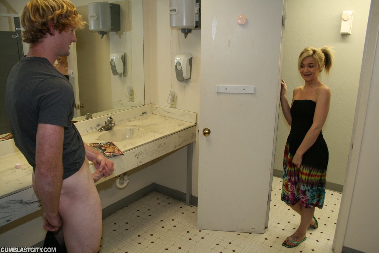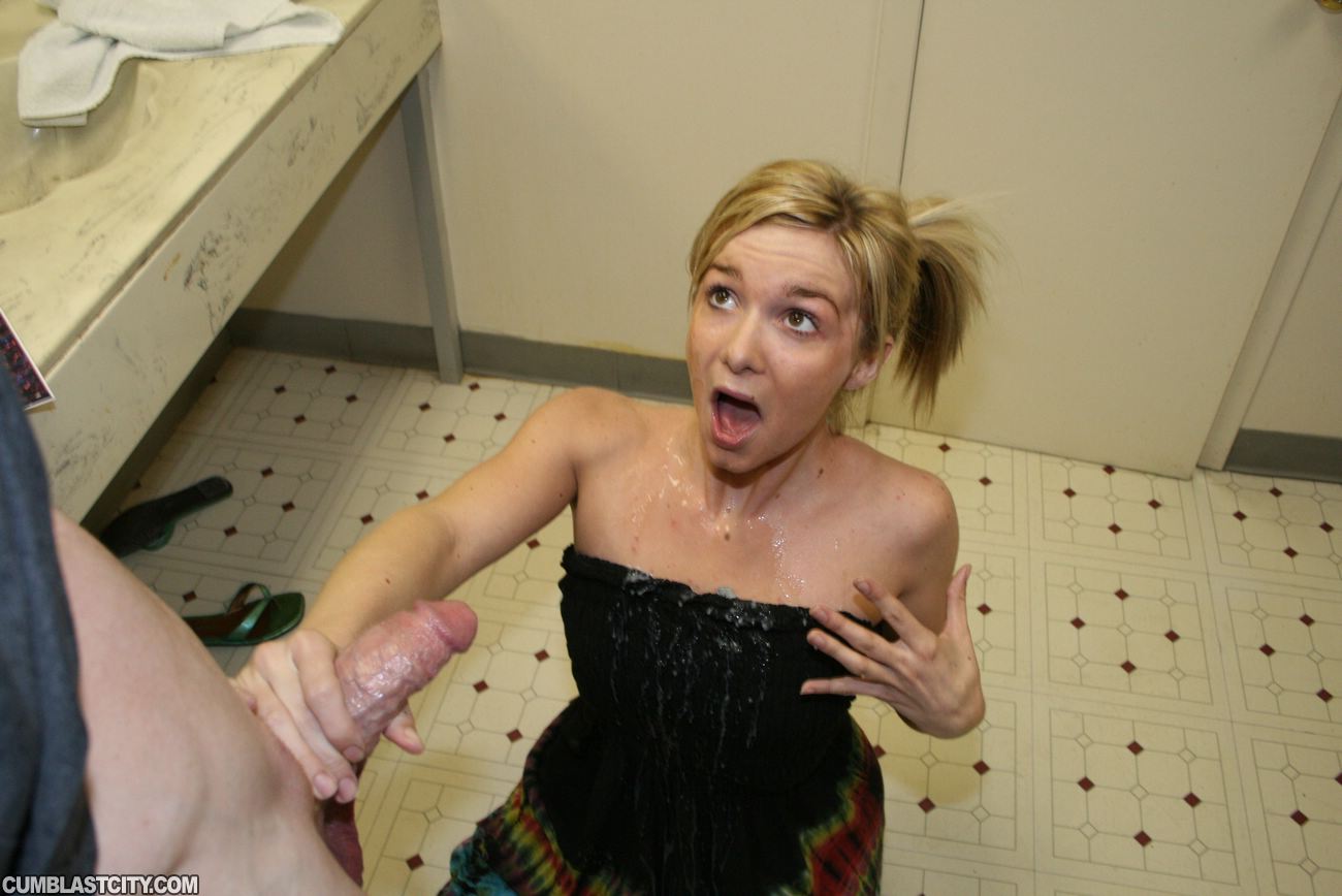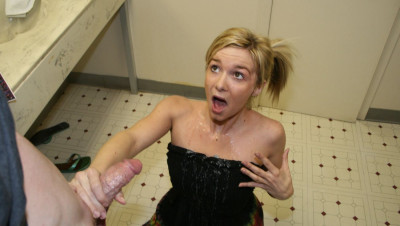 Teen Ericka catches William pulling his pud in a storage room. The shocked teen likes when she sees him jacking off his massive cock. Ericka reluctantly joins in and starts milking his cock when she is splattered with salty goo.