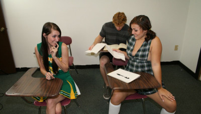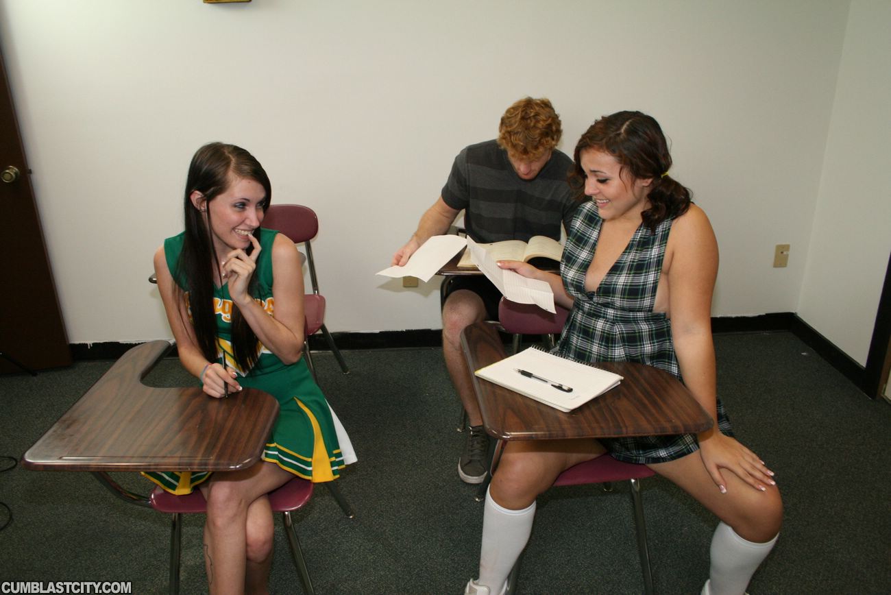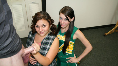 Bratty teenagers Kaci and Ashley love making guys cum, especially the new guy. The teens exchange notes to pass time when they get bored and decide to milk Joeys mega sized boner, little do they know he packs a mega sized cum load.