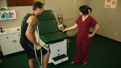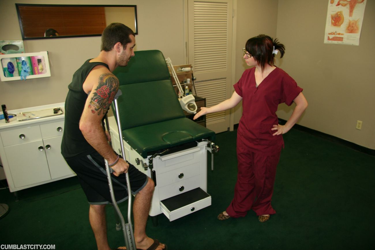 When Billy goes to see the nurse about his bum leg, he also tells nurse Dakota about his ejaculation problem. He can cum a lot more than most guys. Dakota is in shock, and curious. She closes the door behind her and starts jerking his throbbing dick to see for herself.