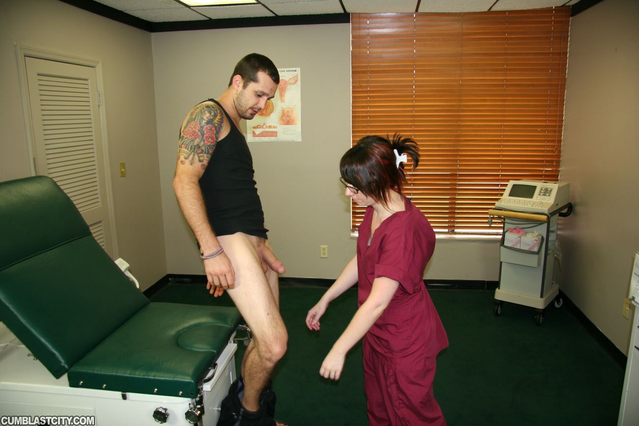 When Billy goes to see the nurse about his bum leg, he also tells nurse Dakota about his ejaculation problem. He can cum a lot more than most guys. Dakota is in shock, and curious. She closes the door behind her and starts jerking his throbbing dick to see for herself.