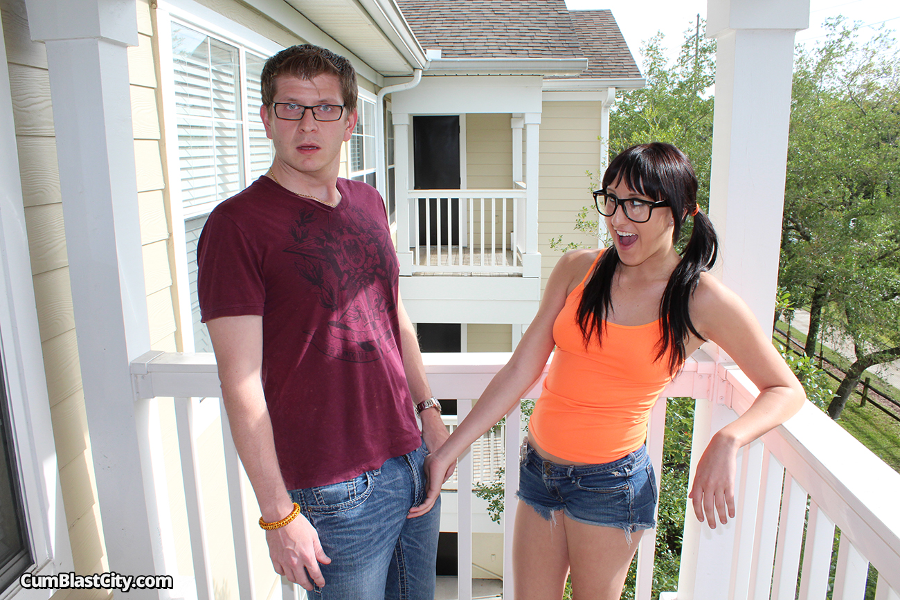 Horny geeky Vanessa meets her step-sister's bf for first time. While they are alone in the balcony, the young slut feels curious to see what he has got in his pants, and starts stroking his monster sized prick. She jerks until his swollen ballsack unloads his goo all over her.