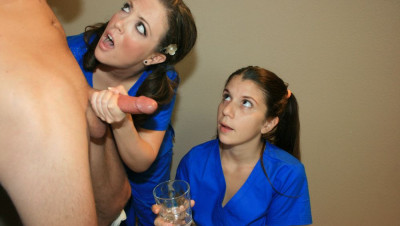 College nurses in training Sofia and JC check Mr. Johnsons sperm count. The teen nurses clean him up and begin the process of milking his cock dry. Sofia works his cock hard, while JC stands by ready to collect his salty cum for analysis.