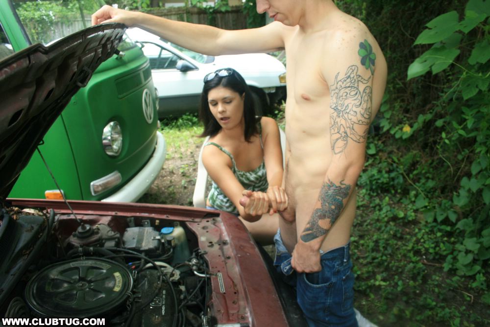 When teener Amo becoms stranded, she'll do whatever it takes to get out alive, even stoking off any big cock that comes her way. When Timmy offers help, Amo jacks off his cock in exhange, making the man to spurt all over the engine block.