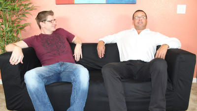 Busty milf Stacie Starr meets her step-son for first time. The perverted lady shows him her big boobs before giving both her husband and her step-son a double handjob on the couch. Stacie strokes those two cocks and makes them cum on her huge tits.