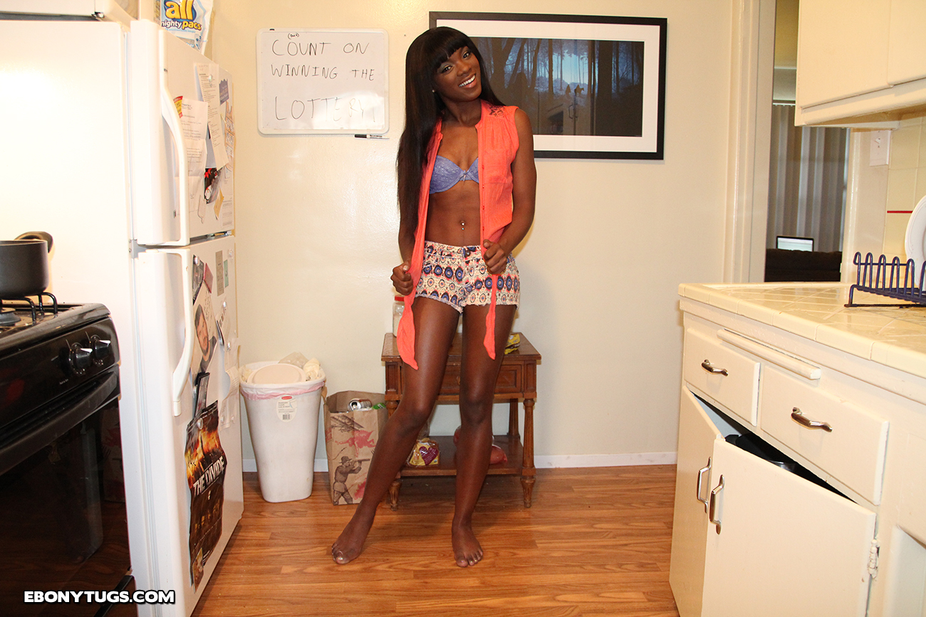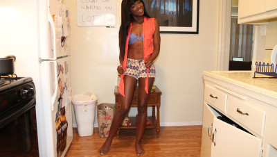 Billy visits sexy ebony Ana Foxx while she is washing the dishes at home. The hot babe is always happy to give him a handjob, so she stops washing and gets naked. Ana sits on her knees while jerking Billy's cock, asking for a facial cumshot. Billy does never say "no" to a sexy lady, so he explodes his cum in her face.