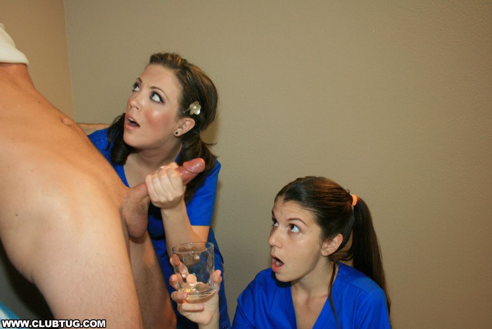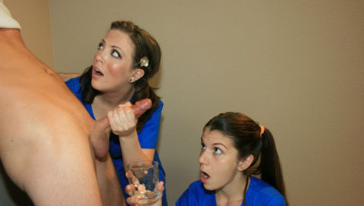 College nurses in training Sofia and JC check Mr. Johnsons sperm count. The teen nurses clean him up and begin the process of milking his cock dry. Sofia works his cock hard, while JC stands by ready to collect his salty cum for analysis.