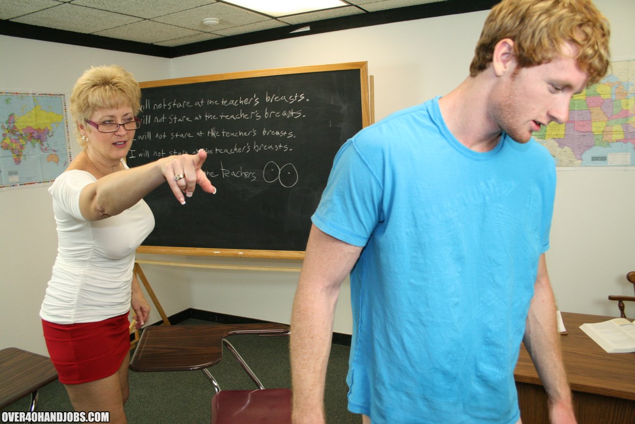 Young Jonny has misbehaved in class again, this time staring at Mrs. Tracy's gigantic juggs. The perverted teacher makes him write on the board, but when this punishemnt doesnt work, the jerks his cock only to bring him to the brink of orgasm them slapping him on the head.