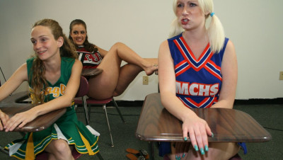 Bratty cheerleaders Barbi Katie and Hailey love a little competition. When they spot Johnny they decide to have a little competition, to see if they can make him spurt. The three sluts milk his cock dry while they cheer each other on.
