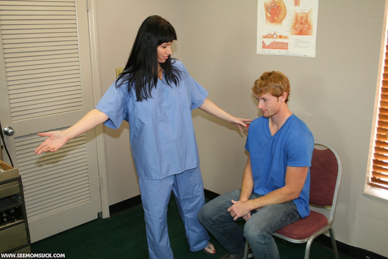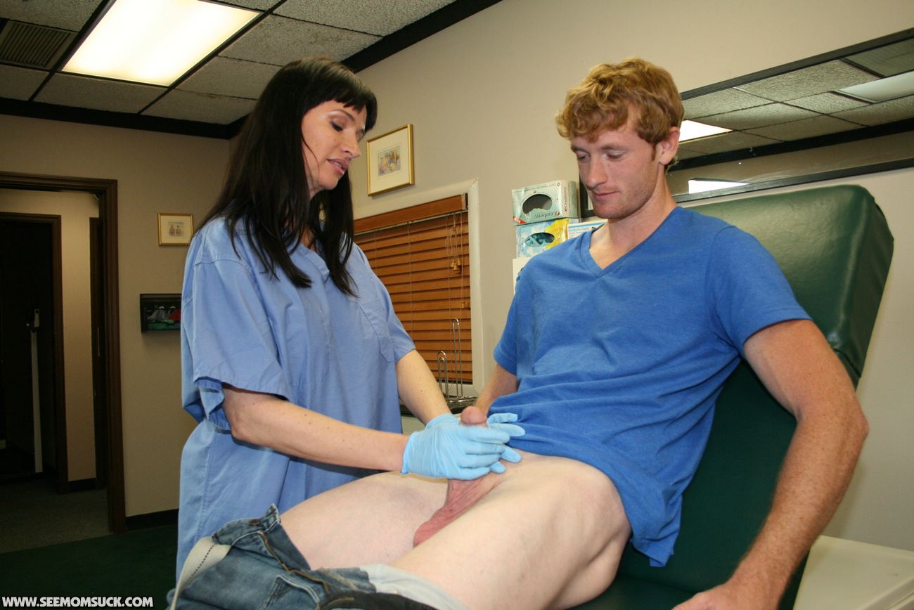 Alex takes Joey to visit his mom, a nurse at the local clinic. Mrs. Niore is shocked to see the size of Joeys dick and starts to rub it. Joey gets hard from excitement. Moments later Mrs Niore is sucking on it hard.