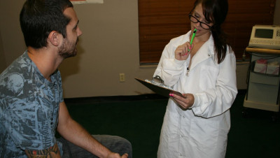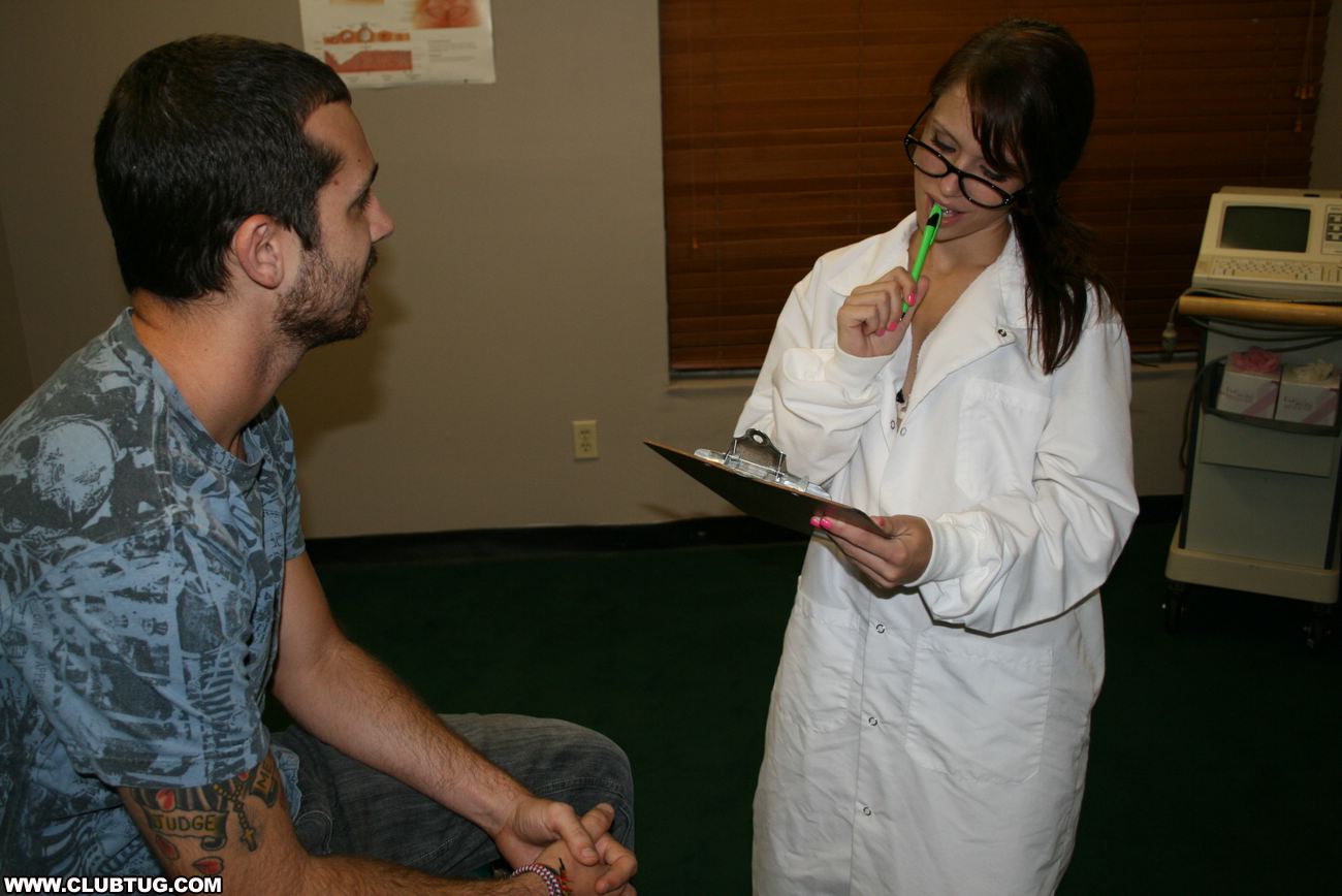 Poor Joey is having a problem "down there", and he needs to get it checked out. Lucky for him sexy nurse Jenna is there to relive his pain. She whips on her latex gloves and instinctively tugs away at his large dick, making him spurt out a nice big semen sample for testing.