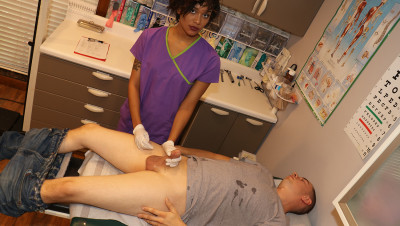 John is in for his exam when the doc steps our for an emergency. Luckily Nurse Barnes is available to extract the needed samples. She pulls out his hard cock and milks him with latex gloves, stroking his hard cock until he accidentally explodes his semen, shooting his goo over his shirt. Nurse Jasmine believes shes has enough for a sample.