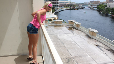 Billy dares his wife, Cheyenne Leigh, to do anything to the next door guy. The horny lady invites the stranger at their room, and starts jerking him off, while Billy, is watching. Cheyenne Leigh gives the lucky dude an awesome handjob, until he explodes with a massive cumshot.