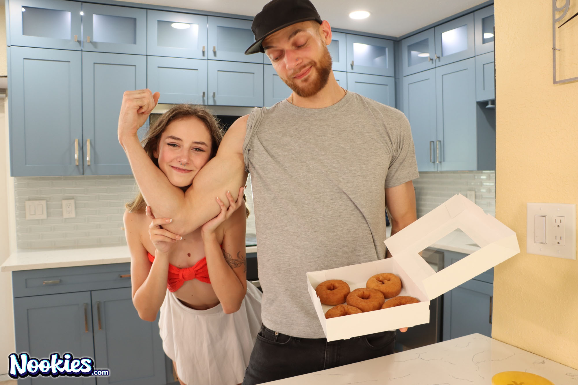 On his food cheat day, Cali decides to order some donuts. He wants 2 chocolate dipped, 2 birthday cake, and 2 glazed. When the order is delivered, he notices one of the glazed donuts is missing the actual glazing. After bringing it to her attention, Daisy Fox finds a fun and creative way to decorate the plain donut with his very own special cum glazing.