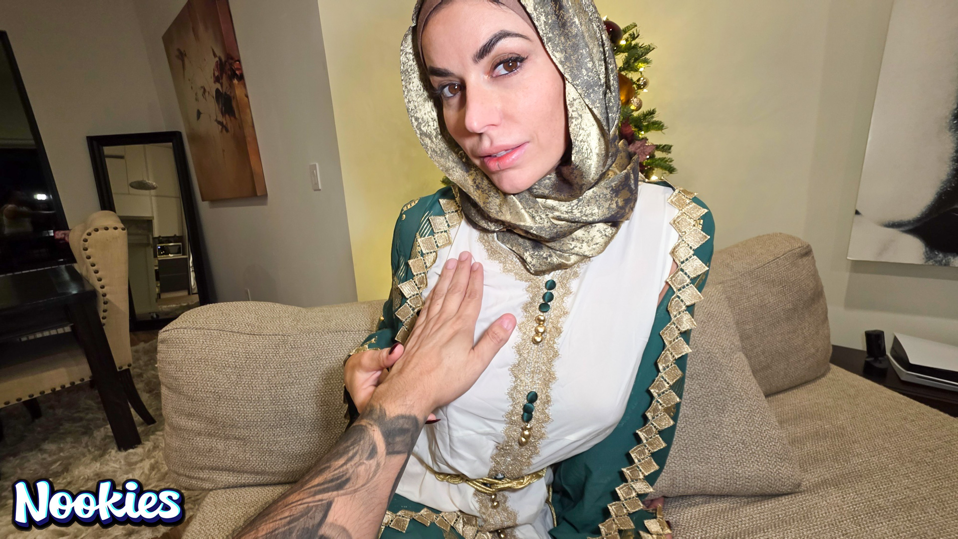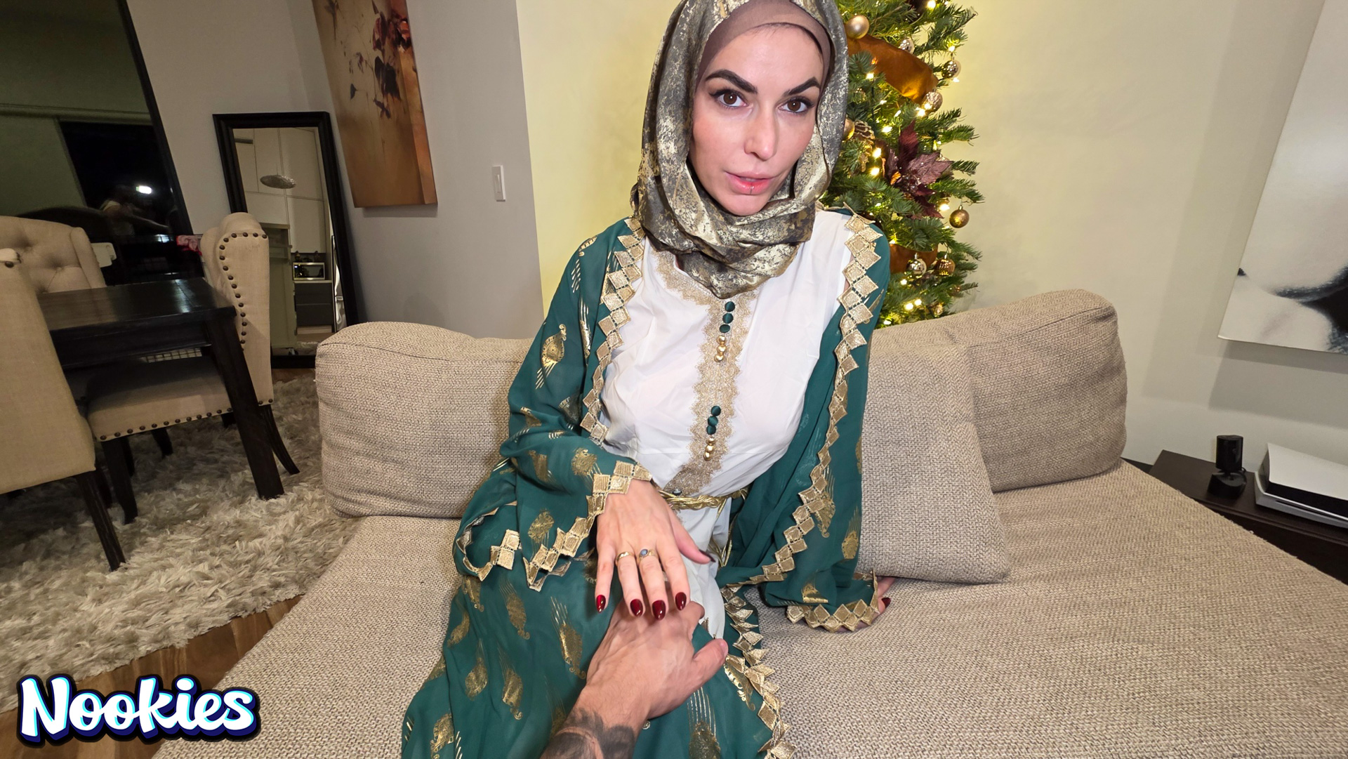 A lonely college student with no place to spend Christmas is invited to dinner by his hijab-wearing professor Mrs. Valencia. She complains about her husband always being away and the conversation turns intimate. What starts as a kind gesture ends with them crossing a line into a balls deep fuck for the stunning hot wife professor and ends with a messy facial.