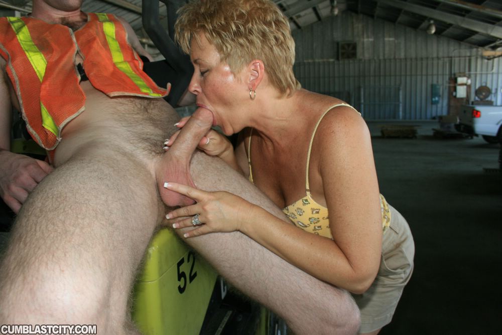 Perverted secretary Tracy sucks off a consturction workers big cock and makes him explode buckets of jizz.