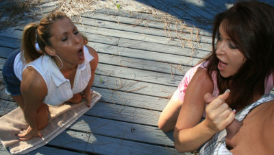 Mrs. Steele and Mrs. Starr see Jimmy wanking his wood, again right in public. In order to releive him the two curious milfs decide to milk him dry by sucking him off and taking turns blastig each other faces with his spunk.