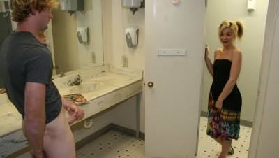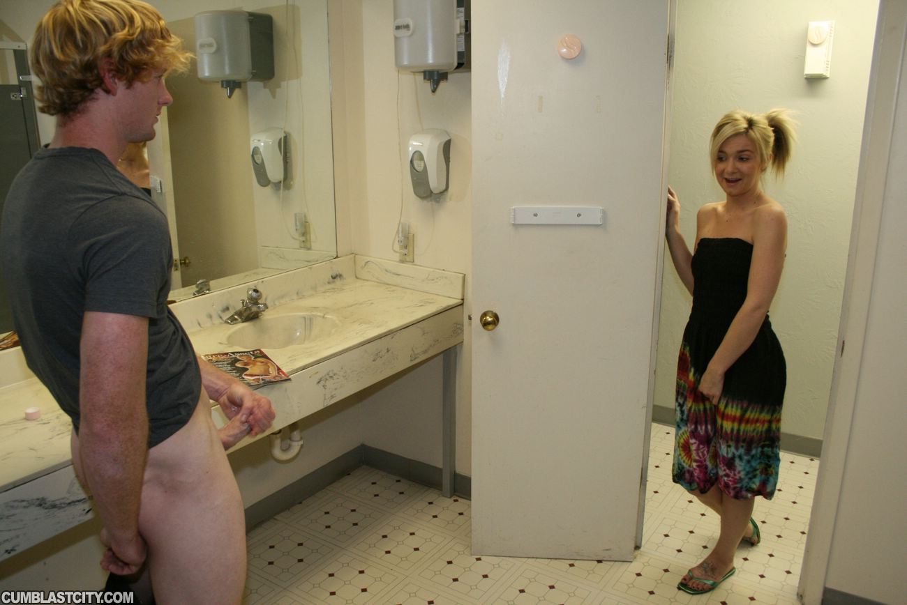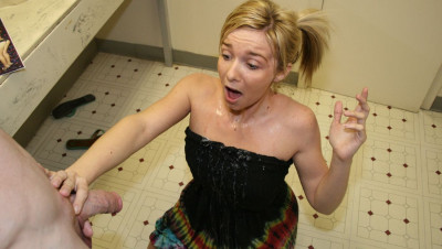 Teen Ericka catches William pulling his pud in a storage room. The shocked teen likes when she sees him jacking off his massive cock. Ericka reluctantly joins in and starts milking his cock when she is splattered with salty goo.
