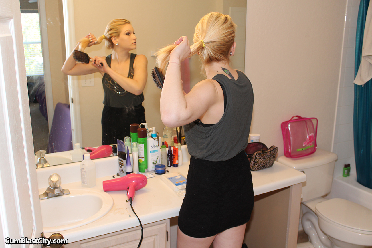 Sexy Amber Sativa is having a shower, when Billy gets in the room asking to join her. Actually, what this dude has in mind is to ask for a handjob, and that is exactly what he gets. The naked blonde babe strokes his big cock in the bath tub, and makes him explode with a huge cumshot in her sweet face.