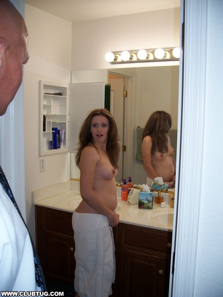 Teener Christa catches perverted neighbor Tom peeping on her in the bathroom. The old perv trickes the innocent teeen to stroke his big cock off all over her face.